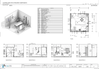The bathroom provides for assisted bathing of patients, patient dressing, undressing, grooming and handwashing. Facilities include a toilet, handbasin and a separate shower within the room. A fixed island bath may be required depending on specialty (i.e. burns, paediatrics etc). The bathroom should allow for manoeuvring of a patient on a lifting device or shower trolley. Placement of the toilet should allow assistance from both sides.
