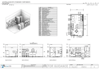 The Dirty Utility, 12m² provides a space for the decontamination and storage of bedpans, urinals and bowls, testing and disposal of patient specimens, disposal of clinical and other wastes, cleaning and holding of used equipment for collection, and holding of soiled linen for collection. Note: due to the availability of washers that do not require pre-handling of items a spray hose and flushing rim sink are no longer included in the Dirty Utility, 12m² fit out.
