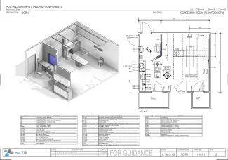 The Screening Room (Fluoroscopy) is a room used to undertake radiographic procedures involving contrast media. Patient change, toilets and shower should be located in close proximity. The room may include a preparation area with sink.